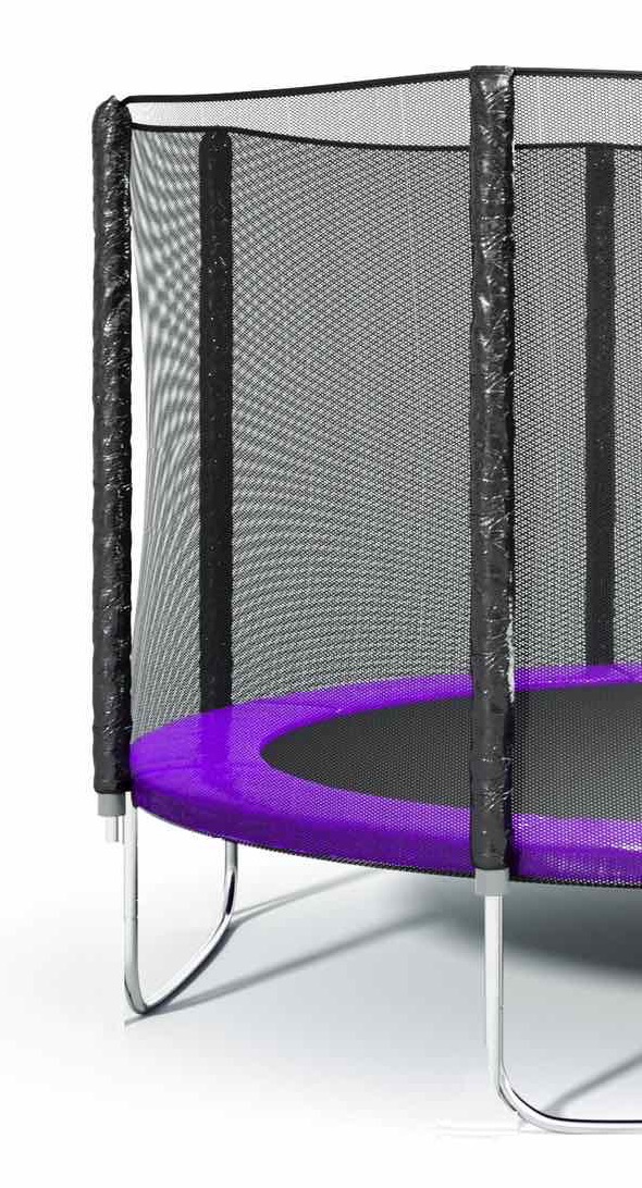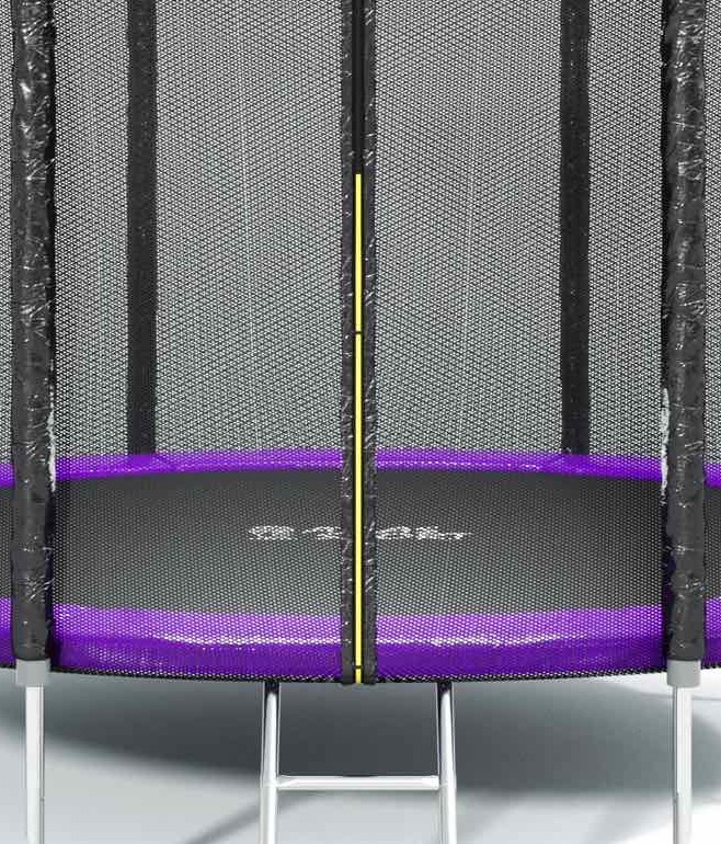 - Уплотненное прорезиненное защитное покрытие толщиной 12 мм и шириной 36 см полностью закрывает пружины и каркас рамы батута, тем самым исключая падение ног в эту часть и последующих за этим травм.