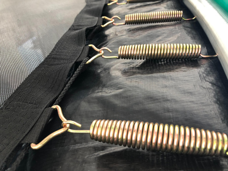 - Пружины присоединяются к полотну при помощи треугольных карабинов на петле, каждая из которых прострочена 8-ю плотными фабричными швами, что полностью защищает от разрывов в местах крепления пружин.