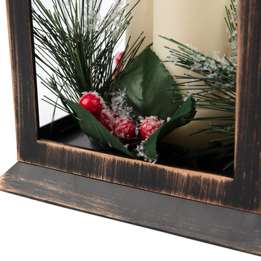 Декоративный фонарь со свечкой и шишкой, бронзовый корпус, размер 14x14x27 см, цвет теплый белый