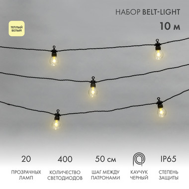 Набор Белт-Лайт 10 м, черный каучук, 30 ламп, цвет Белый, IP65, соединяется