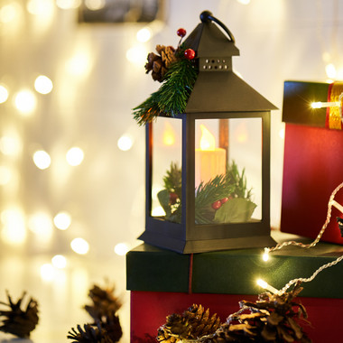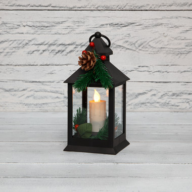 Декоративный фонарь со свечкой и шишкой, черный корпус, размер 10,7×10,7×23,5 см, цвет теплый белый