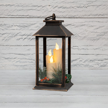 Декоративный фонарь с тремя свечами, бронзовый корпус, размер 24х24х65см, цвет теплый белый