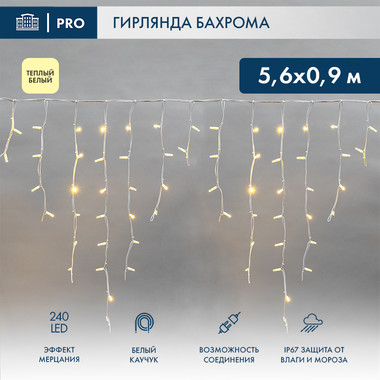 Гирлянда светодиодная Бахрома (Айсикл), 5,6×0,9м, 240 LED ТЕПЛЫЙ БЕЛЫЙ, белый КАУЧУК 3,3мм, IP67, эффект мерцания, 230В NEON-NIGHT (нужен шнур питания 315-001)