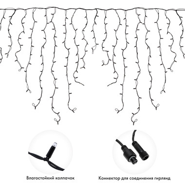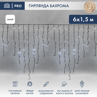 Гирлянда светодиодная Бахрома (Айсикл), 6,0х1,5м, 480 LED БЕЛЫЙ, черный КАУЧУК 3,3мм, IP67, постоянное свечение, 230В NEON-NIGHT (шнур питания в комплекте)